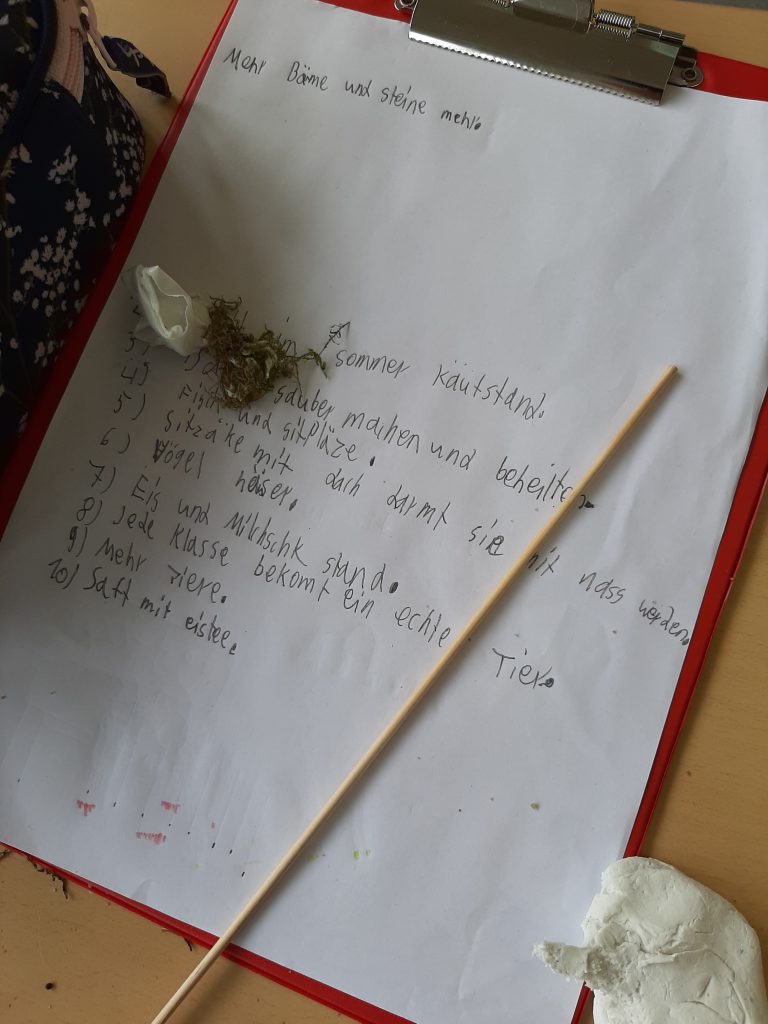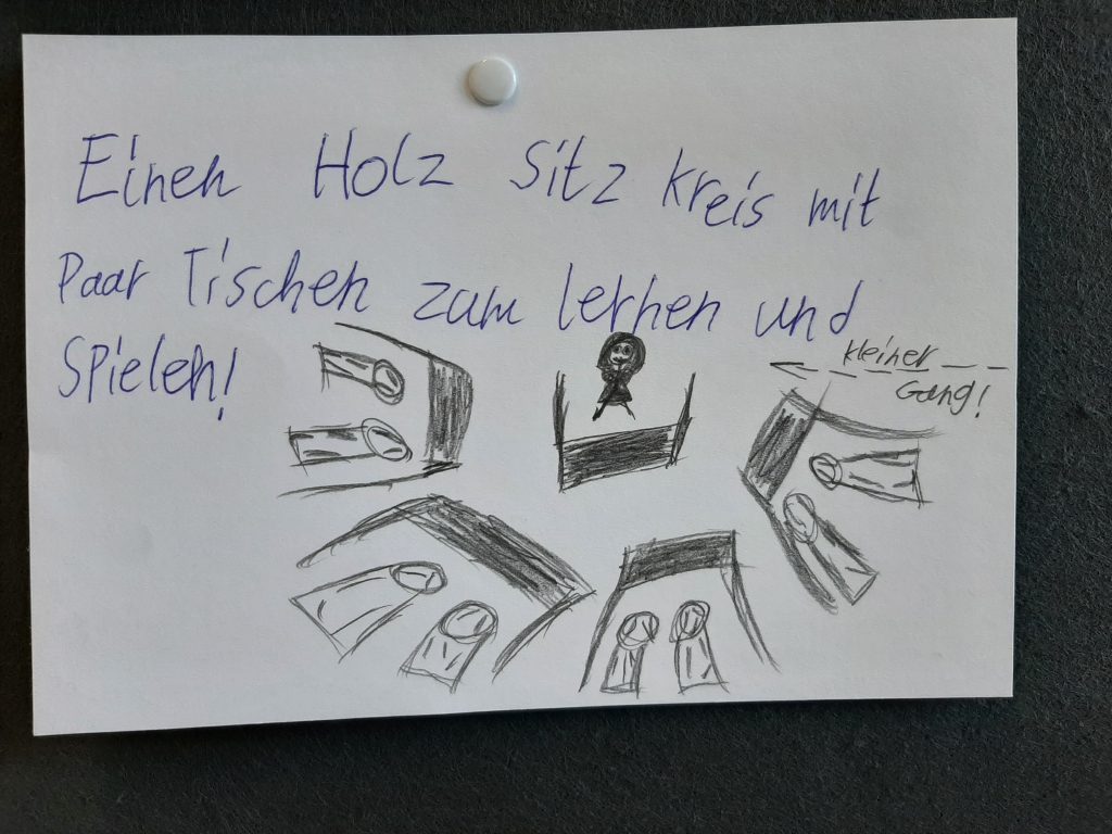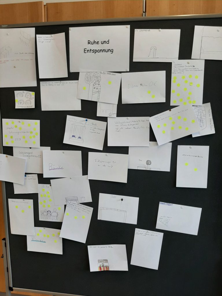 Einen ganzen Schulvormittag lang wurden Ideen für eine zukünftige klima- und naturfreundliche Gestaltung des Schulgeländes erarbeitet. Was können wir für ein angenehmes Klima auf dem Schulgelände tun? Was möchten wir auf dem Schulhof überhaupt machen? Gibt es jetzt schon Lieblingsecken? Welche Sporteinrichtungen, Sitzmöglichkeiten, Spielgeräte oder Sonstiges wären unser Traum? Soll unser Schulgelände mehr Raum für Pflanzen oder Tiere haben? Diese und viele weitere Fragen standen im Mittelpunkt. „Ich fand es so toll, einbezogen zu werden. So können wir mitbestimmen, wie wir uns das wünschen und was wir brauchen“, kommentiert Mara begeistert.
