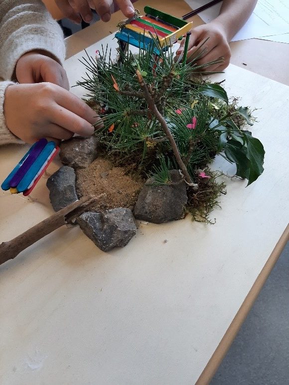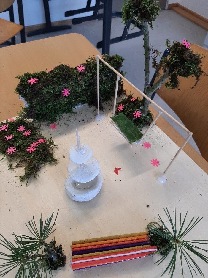 Mit diesen Ergebnissen wurde im zweiten Teil des Vormittags weitergearbeitet. Die Mitglieder der Klima-AG und des Projektkurses Artenschutz hatten sich schon vorher damit beschäftigt, welche Eigenschaften ein klima- und naturfreundliches Gelände haben muss. Sie waren so etwas wie Experten. Mit Blick auf die vorher gesammelten Wünsche machten sie sich ans Werk und erstellten ganz konkrete Modelle des zukünftigen Wunschschulhofs. Knete, Filz, buntes Papier, Stöckchen, Steine, Blätter und Moos: Alles wurde dabei verarbeitet. „Das hat super viel Spaß gemacht. Wie krass wäre es, wenn der Schulhof echt so aussehen würde“, sagt Lina dazu. Ceyda denkt dabei sogar nicht nur an die Pausen: „Unser neuer Schulhof wäre so ein Ort, an dem Lernen draußen weitergeht.“