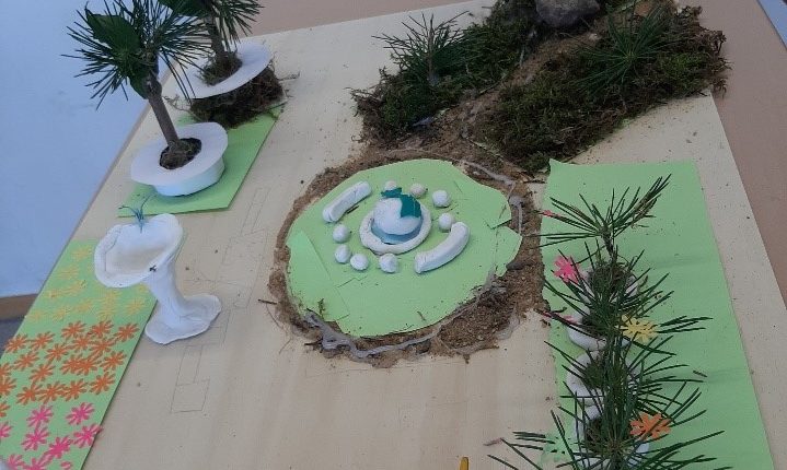 Mit diesen Ergebnissen wurde im zweiten Teil des Vormittags weitergearbeitet. Die Mitglieder der Klima-AG und des Projektkurses Artenschutz hatten sich schon vorher damit beschäftigt, welche Eigenschaften ein klima- und naturfreundliches Gelände haben muss. Sie waren so etwas wie Experten. Mit Blick auf die vorher gesammelten Wünsche machten sie sich ans Werk und erstellten ganz konkrete Modelle des zukünftigen Wunschschulhofs. Knete, Filz, buntes Papier, Stöckchen, Steine, Blätter und Moos: Alles wurde dabei verarbeitet. „Das hat super viel Spaß gemacht. Wie krass wäre es, wenn der Schulhof echt so aussehen würde“, sagt Lina dazu. Ceyda denkt dabei sogar nicht nur an die Pausen: „Unser neuer Schulhof wäre so ein Ort, an dem Lernen draußen weitergeht.“